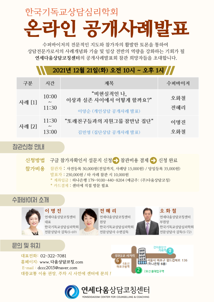 한국상담심리학회, 한국상담학회, 한국기독교상담심리학회, 한국목회상담협회 수련생 | |