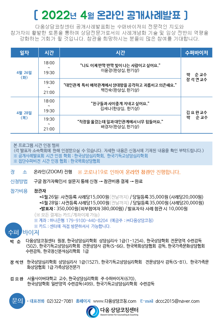 한국상담심리학회, 한국기독교상담심리학회, 한국목회상담협회 수련생 | |