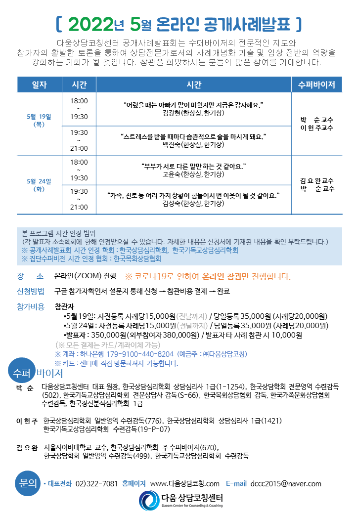 한국상담심리학회, 한국기독교상담심리학회, 한국목회상담협회 수련생 | |