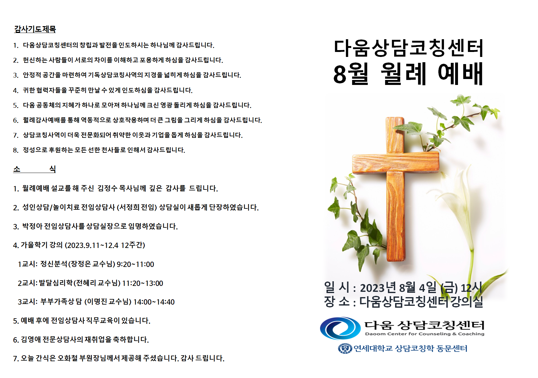 < 다움상담코칭센터 8월 월례예배 안내 >