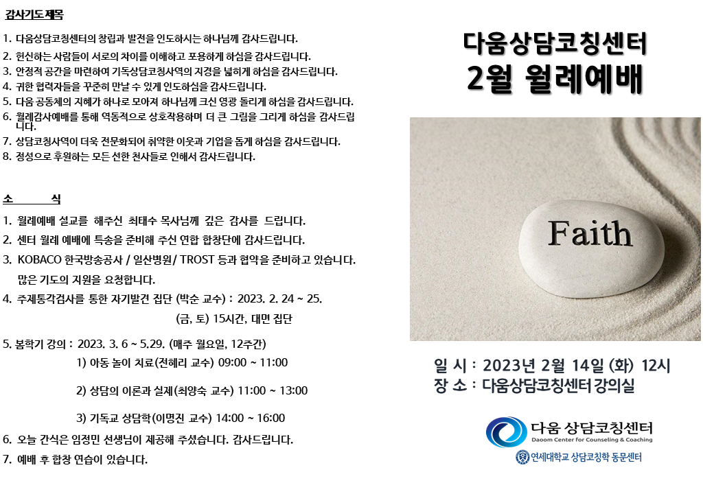 주제: (주)다움상담코칭 2023년 02월 14일 월례예배